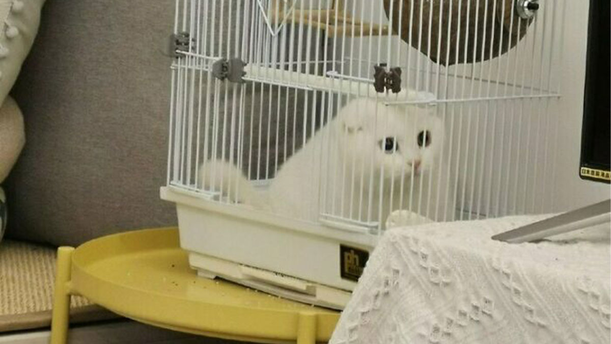 You mean, the human's choice to cram their poor cat into their bird's cage, which, as an aside, is FAR too small for that birb to have a happy, healthy life in?