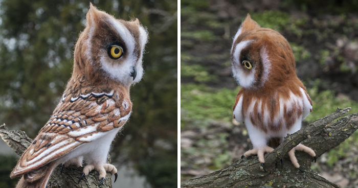 More than 120 hours I pinned a thin needle in sheep’s wool (and sometimes in my fingers) to create it. The creation of this felt sculpture inspired me to Eastern screech owl (Rufous morph). I really love this job and I’m proud of it.