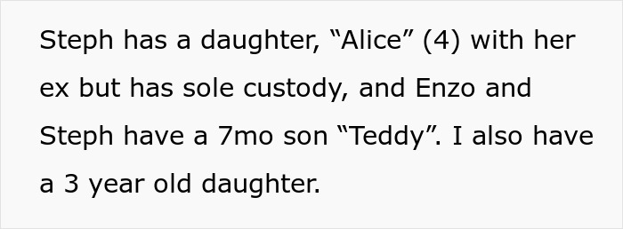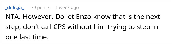 Load More Replies...NTA. Steph is a neglectful parent; Enzo is enabling her. OP has the right idea in calling the police the next time. Unless they and CPS get involved, it's only a matter of time before this story will have a tragic ending.