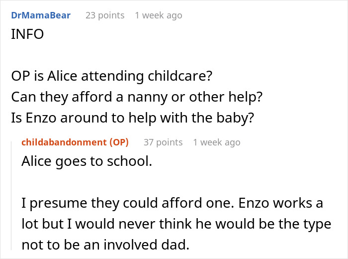 Or she can’t cope with Alice and the new baby and is taking the opportunity to get rid of Alice a couple of times a week rather than spend time with her. If OP doesn’t call the CPS then Enzo needs to actually sit down with her and get her to talk about why she keeps abandoning her daughter. Maybe she needs help, either a nanny or a therapist but it seems like he’s not concerned enough about why she’s doing this.