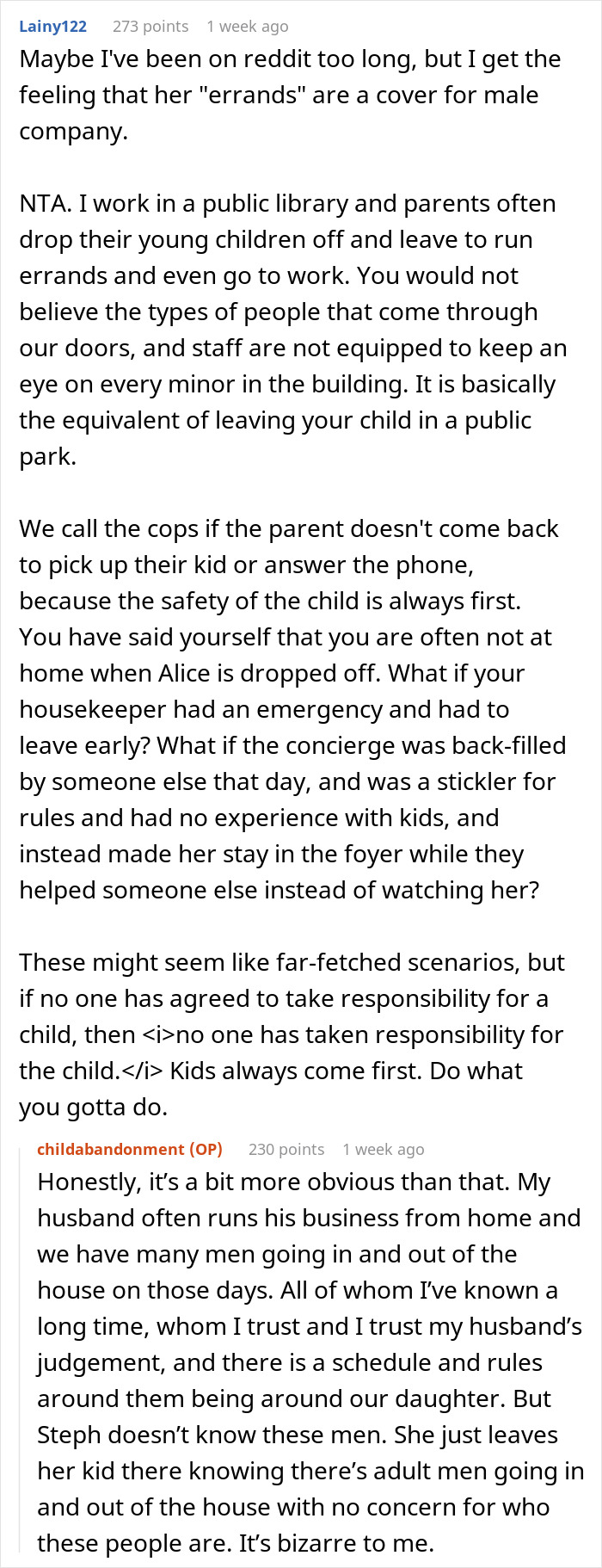 Load More Replies...She just dumps the poor kid in the hallway and leaves? And the kid's father knows about it and does nothing? Hell yes she should have called CPS a long time ago.