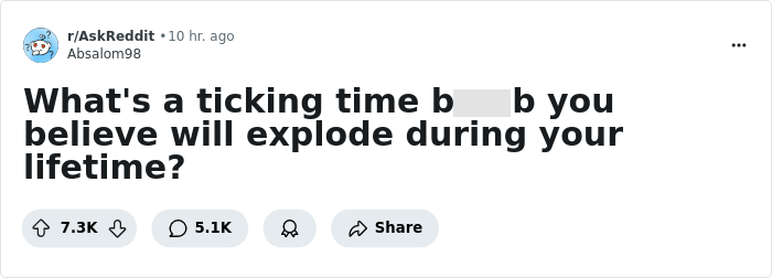 One person recently asked an online community, “What’s a ticking time [explosive] you believe will explode during your lifetime?”, and netizens were only too happy to weigh in. Here’s a collection of their most disturbing predictions.