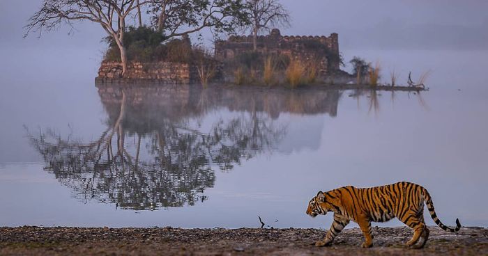 Referencing this once-in-a-lifetime shot of a tiger strolling by the ruins of an ancient temple, the photographer wrote on his Instagram page: “One of Arrow’s girl walking in front of Padam Lake this morning in magical Ranthambore National Park. It was freezing cold, full of fog and mist and I couldn’t feel my fingers, glad that I was able to press the shutter on my camera. It was such a special moment, one that I have been waiting for, for as long as I can remember, finally nature has blessed me with this. I am ever so grateful. For me, this image has captured the heart and soul of Ranthambore.”
