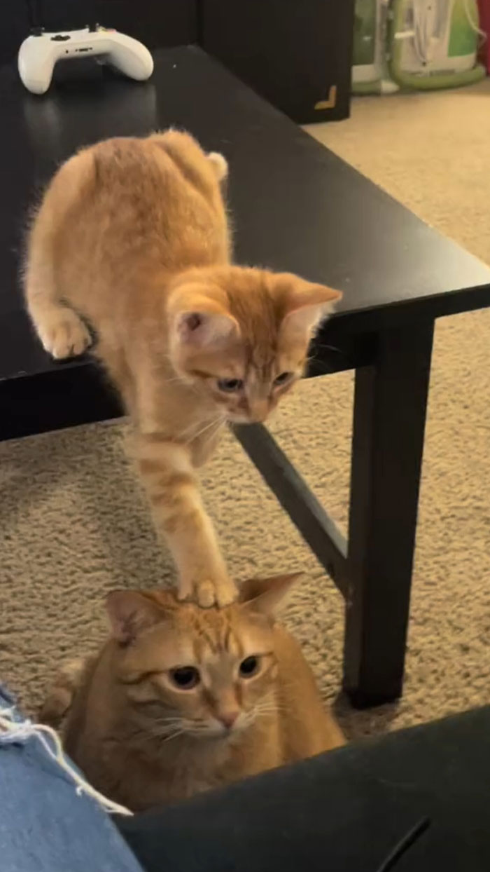 Showing superiority... me sits on you, small fink. Me stands mighty tall over you baby kitty