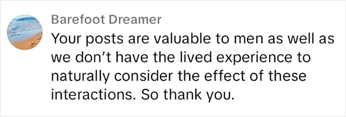"Men need to call other men out on this behavior. A lot of men who believe they are the good guys will let this behavior slide, especially when it comes to their friends. They may apologize on their friend's behalf, but they don’t actually hold their friend accountable, so the behavior doesn’t change," she told Bored Panda.