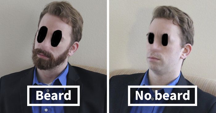 “For this funny experiment to work, I needed to reduce any bias unrelated to the beard. So to start, I took five pictures of myself with my facial hair in different settings with different outfits. For the purposes of anonymity (and my own amusement), I have blurred out my face and eyes in the below pictures:”