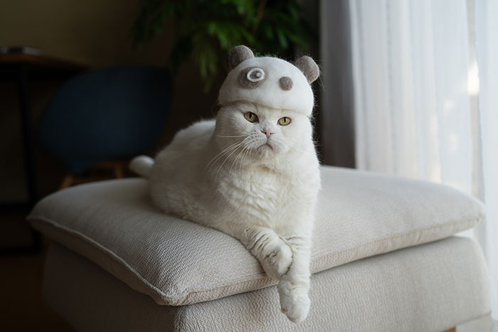 Their creative journey began when Umatan, having just finished brushing their cat, collected the stray hairs from the brush and stacked them one upon another. The hairs piled up, resembling a miniature mountain. Curiously, she decided to place this hairpile atop the cat's head, and the feline responded with a remarkably clear expression. "It was so surreal, yet so cute, that I wanted to make something more with the hair. I thought that if the pile of hair was more like a hat, it would be easier to put it on the cat's head. I pressed and rubbed the hairs with my hands to test them, and they hardened like felt, so I shaped them so that the cat's head would fit into them. That was the first hat I made, the Acorn Hat," Umatan told Bored Panda.