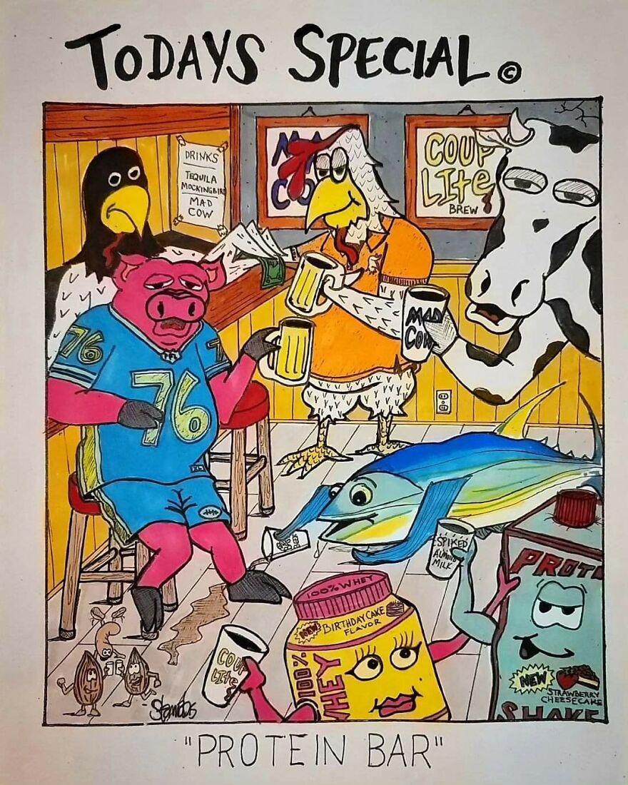 The characters, a delightful mix of cows, chickens, pigs, vegetables, fruits, and just about anything else that can tickle your funny bone, will have you laughing out loud the next time you're perusing a menu at your favorite diner.