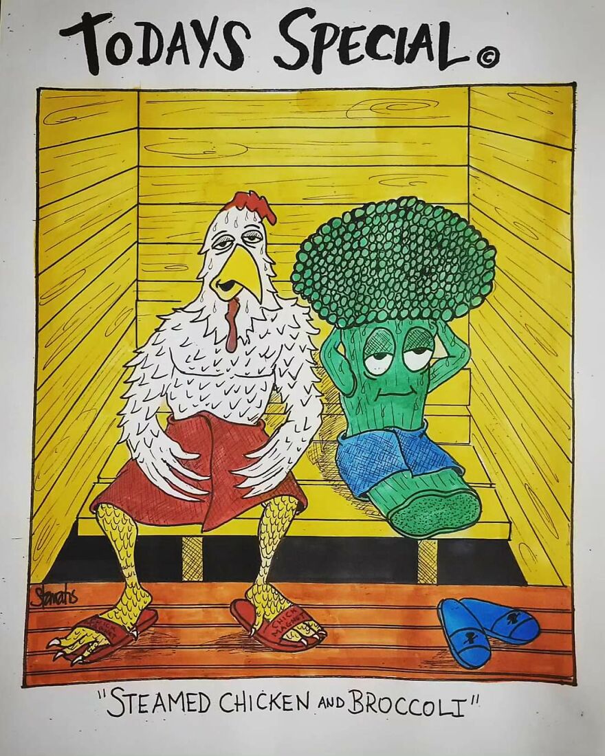 The comic's play on words referencing food and menu items is witty, smart, and clever.