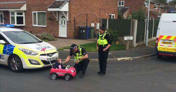 Share on FacebookThe police in this article had just arrested a male for driving with no insurance and for being 2X the legal drink drive limit. They were waiting for the duty garage to arrive to remove the offenders car, when Lily rocked up in her cool little pink mini. The officer explained the situation to her parents that a drunk driver, who lived on their road had been arrested and his car seized, AND that their daughter could now play safely outside, The officers were asked to pose for a picture with their daughter! The officer asked the toddler to blow into the breath test device, just like blowing up a balloon. The same analogy he uses with all suspected drink drivers. She was a natural!.... A great job by all, especially Lily, who managed to swerve in on the action as it happened!