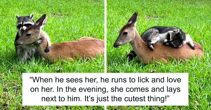 Eglė Radžiūtė 70Kviews 2.4K Raccoon Is Completely Obsessed With Fawn Who Lost Mom, Gives Her Hugs Every Day Interview With Owner