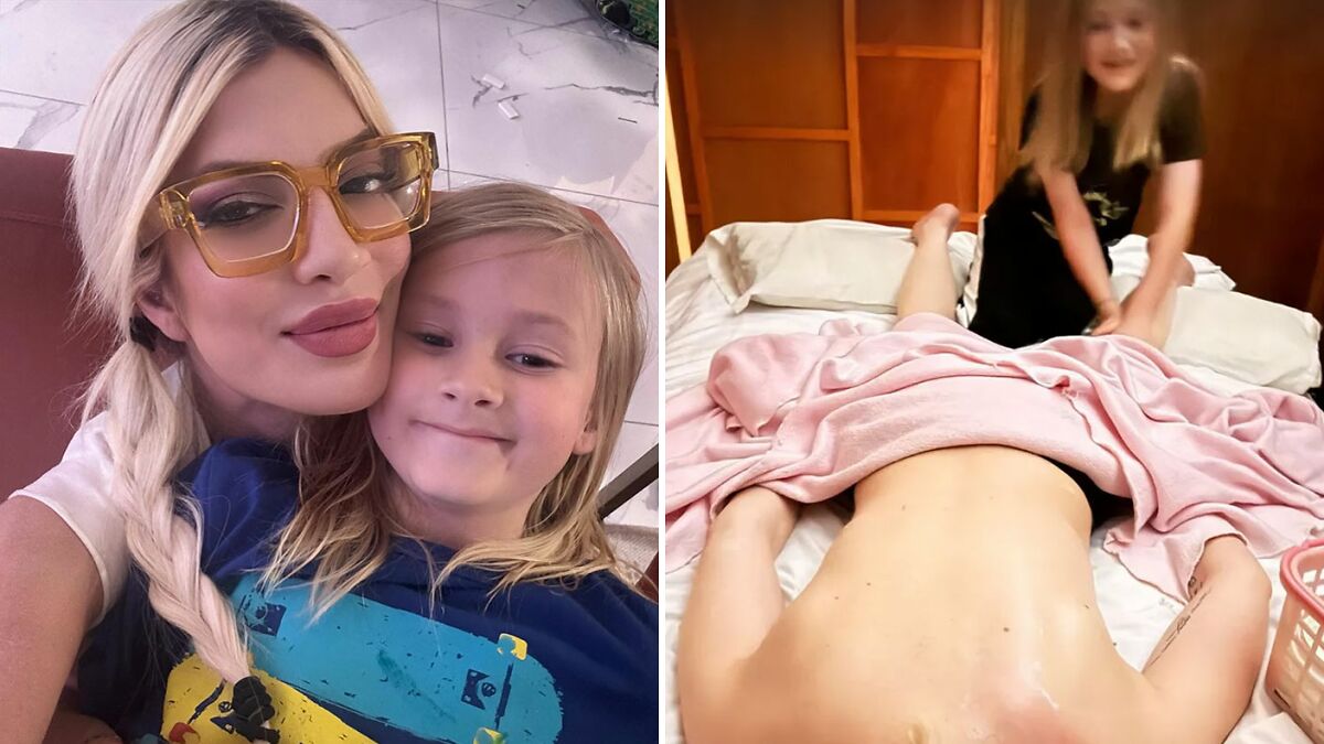 As she candidly shared the moment online, the single mother was pictured lying on a bed without any clothes while her son appeared to give her a massage.