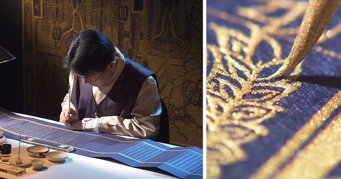 Oegil Kim Kyeong Ho’s incredibly intricate sutra transcriptions are stunning even at first glance but they become even more unbelievable once you hear the story behind them. Like this video by Flushing Town Hall shows, Kim follows the 1,700-year-old tradition of sutra transcription that has its roots in the Kingdom of Goryeo (918-1392). Back then, Buddhism was officially supported by the king and state, which led to a flourishing of Buddhist art. Gilt-painted manuscripts, which were both expensive and time-consuming to make, were also commissioned. Unfortunately, this delicate technique was eventually largely replaced by printing. Thanks to artists like Kim, however, it survived to this day. “When I first held the brush, I was five years old,” Kim told NY Daily News. “It’s been 45 years so far.” Using a brush made of animal hair, the 50-year-old creates painstaking images in gold and silver. He can work for up to 10 hours a day without a break on a single piece of his artwork in temperatures of around 100 degrees. The high temperatures are necessary for the specialized paint.