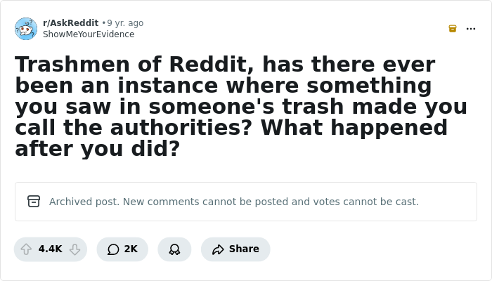I work for a trash hauling company, not necessarily a trashman myself, but kinda am. Anyhow, the prior company I worked for, one of our drivers was instructed to dump his load in the middle of a busy city street because the police thought he may have dumped a dumpster in which they believe a m****r weapon was disposed of.