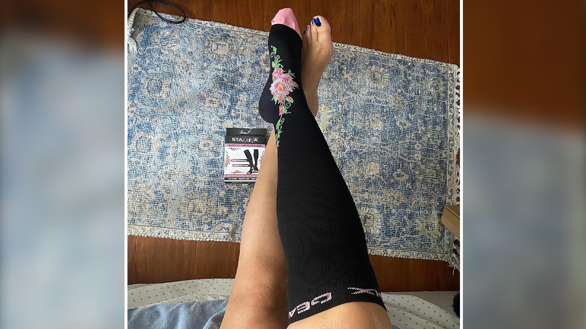 Compression socks with floral design, shown both laid out and worn, affordable for travelers on a budget.