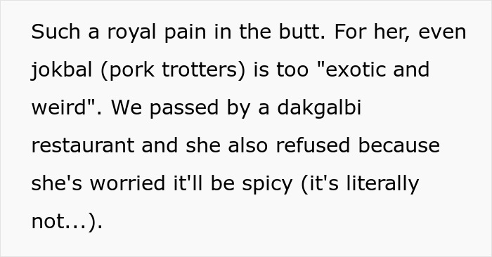 Load More Replies...Hi. Picky eater because of actual sensory processing issues here. Your cousin is just an a*****e. Korean food isn’t my favorite but there are many things that are yummy and I’d never criticize someone ELSE for what they ordered.