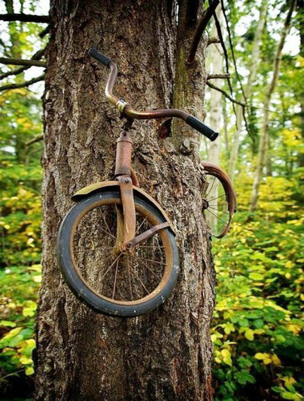 Actually, this title posted yesterday on imgur was incorrect. As some commenters pointed out, the bicycle was in fact left behind in the mid-1950s by a local resident who simply abandoned it. Interestingly, “the tree that ate a bicycle” on Washington’s Vashon Island has even inspired a Berkeley Breadthed’s 1994 book, Red Ranger Came Calling. (sources: imgur, snopes.com)