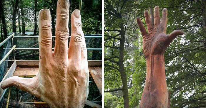 Simon O’Rourke is an environmental artist from North Wales specializing in wood sculpture. Simon’s webpage and social media profiles are full of photos capturing his stunning and unbelievably detailed sculptures, with one of them being this giant 50 ft hand reaching for the sky.