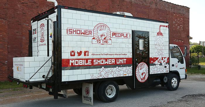 He has been helping homeless people in St. Louis, Missouri for years now, but just recently came up with a brilliant idea: Austin bought an old truck from Craigslist for $5,000 and transformed it into a mobile shower unit titled “Shower to the People”. The mobile shower on wheels contains two shower stalls and a long row of sinks and mirrors, plus Raise the Bar employees give out free soap for people using the unit. Water is taken from fire hydrants and is warmed up with the help of an external generator.