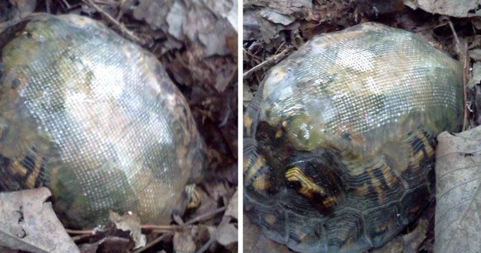 The vet posted a photo of a turtle with a peculiar shell and added the following caption: “Several years ago, a client brought me a box turtle that had been hit by a car. I used fiberglass to repair his broken shell and then released him in my woods.”
