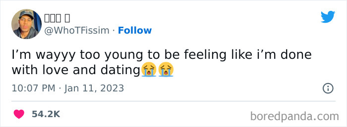 Tweets about dating make up a big stack of content on Twitter. This might be because dating has never been more complicated than it is today. The emergence of situationships ("we like each other but not so much to start dating" -kinda relationships), hookup culture, and the treatment of people like buses ("missed this one, but there will be another one in 10 minutes") have significantly affected how people date (or more appropriately, "hang out") today. And ultimately, this is where the many funny tweets about dating originate from.