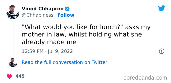 In fact, statistics show that both Gen X and baby boomers prefer Facebook. Hence, Twitter might be one of the few safe spaces left to crack jokes about in-laws without them seeing it! And many are already doing it. Sharing mother-in-law jokes, awkward encounters, or the passive-aggressive exchanges made over dinner, funny tweets about in-laws are simply top-tier. And honestly, in-law relationships are the best content source for funny, relatable tweets. Consider yourself lucky if you don't have in-laws (just yet) and can't relate!