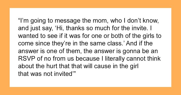 “What I’ve got is that I’m going to message the mom, who I don’t know, and just say, ‘Hi, um, thanks so much for the invite. I wanted to see if it was for, um, one or both of the girls to come, um, since they’re in the same class. Either answer is fine, um, but just let me know.’ And if the answer is one of them, uh, the answer is gonna be an RSVP of no from us because I literally cannot think about the hurt that that will cause in the girl that was not invited.”
