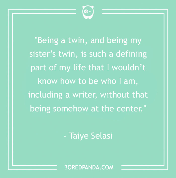 "Being a twin, and being my sister’s twin, is such a defining part of my life that I wouldn’t know how to be who I am, including a writer, without that being somehow at the center." – Taiye Selasi