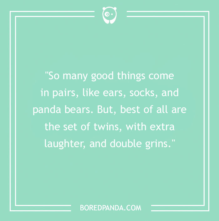 "So many good things come in pairs, like ears, socks, and panda bears. But, best of all are the set of twins, with extra laughter, and double grins."