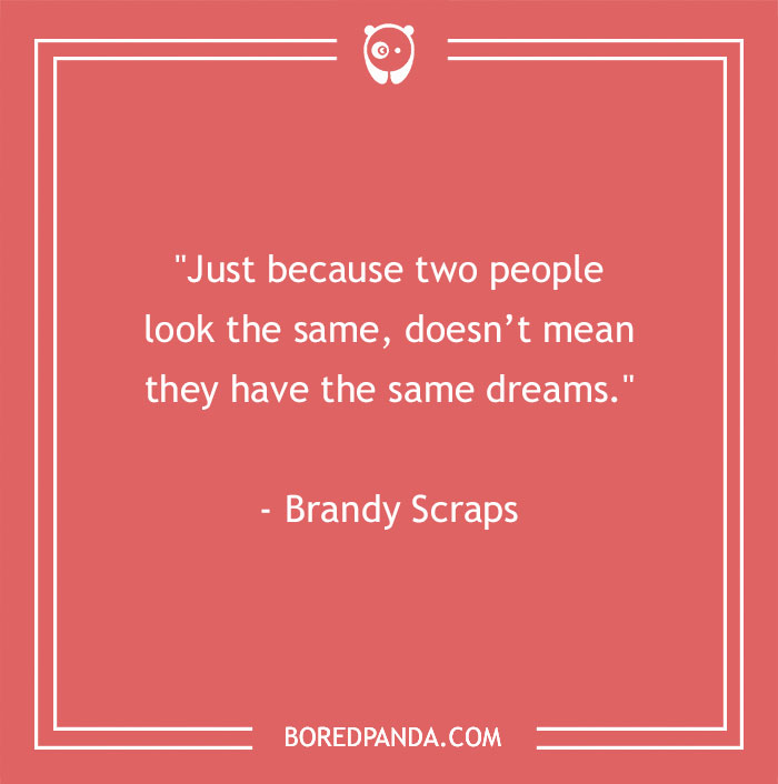 "Just because two people look the same, doesn’t mean they have the same dreams." – Brandy Scraps