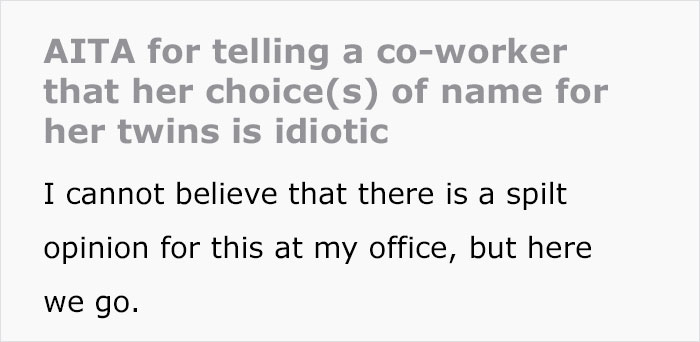 A redditor shared their honest opinion about their coworkers wanting to name their newborn twins identically
