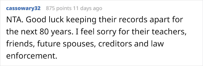 The author of the story ended up getting reported to HR for their post on the AITA subreddit. Ironically, it wasn’t the parents who reported them, as they thought the entire comment about matching names being ‘idiotic’ was pretty hilarious.