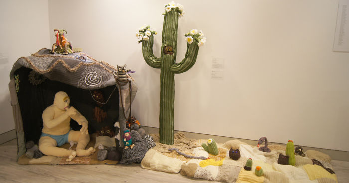 The immersive installation features woodland, desert, and waterfall dioramas constructed almost entirely from yarn and felt.