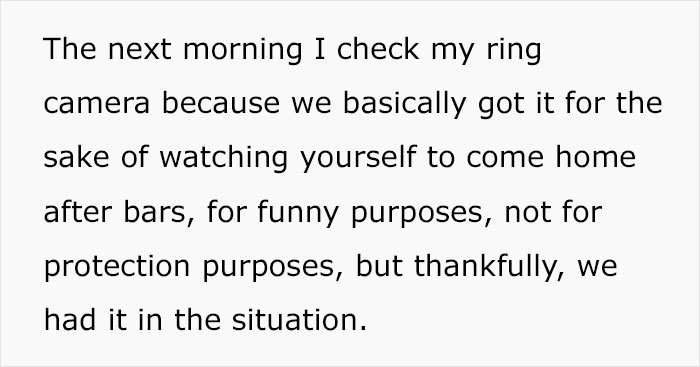 The woman then added that they got the security camera for the sake of watching themselves come home from bars, and not for protection purposes – however, they were grateful to have it this time.