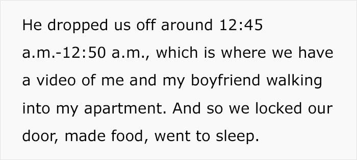 He dropped the couple off shortly after midnight, and they have the footage of them walking into their apartment on their Ring camera.