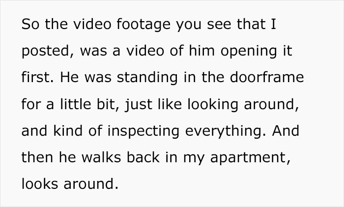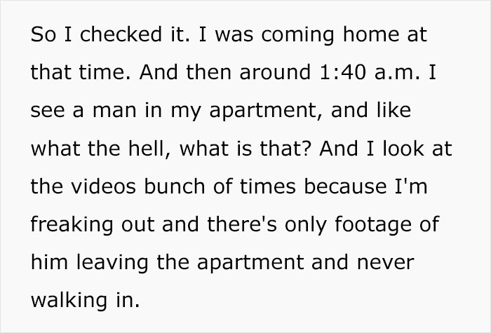 Needless to say, the TikToker was petrified. She kept replaying the moment of the man standing in the doorframe, simply inspecting the place. Shortly later, he exited, leaving the woman wondering about his intentions.