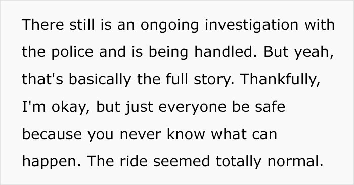 In order to determine whether the viral video is genuine, Bored Panda got in touch with Uber. Austen Radcliff, a safety communications representative, emailed us back with a statement from the company’s spokesperson: “This driver’s actions are unacceptable, and we’ve been in touch with the rider regarding her terrifying experience. The driver has been banned from the Uber app, and we are standing ready to help law enforcement in their investigation.”