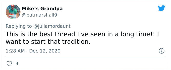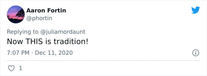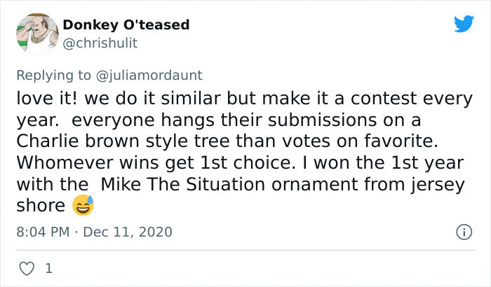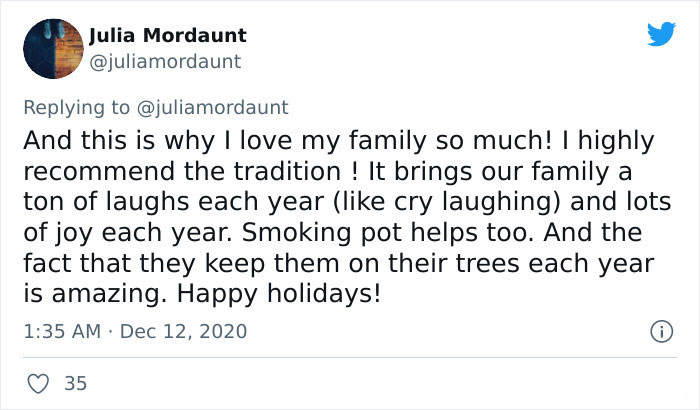 Every year, her mother and sister exchange the ugliest Christmas tree decorations they can find. Both of them take the tradition seriously and constantly try to outdo each other. If one brings a fancy zebra in a skirt and heels, the other presents a deviled egg. If the first responds with a faucet, the second comes back with a perverted gingerbread man. It's a neverending story!