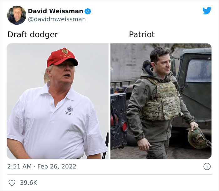 My exact thoughts: Putin riding hoses shirtless and all that fake macho crap, whereas Zelensky is showing what true leadership look like.