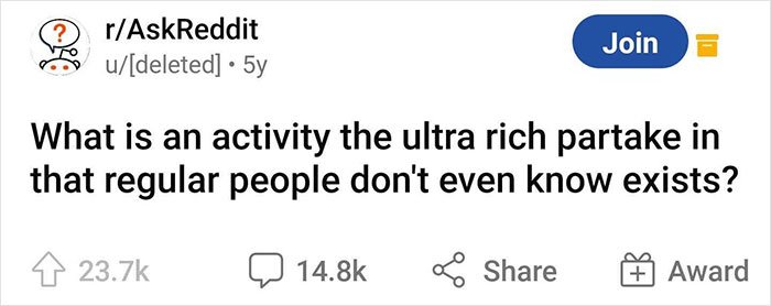 “What is an activity the ultra-rich partake in that regular people don't even know exists?” someone asked a while back on Ask Reddit. The thread amassed 23.7k upvotes and almost 15k comments from people who have experienced the life of the ultra-rich and the quirks that come with it, one way or the other. Below we wrapped up some of the most intriguing and juicy stories.
