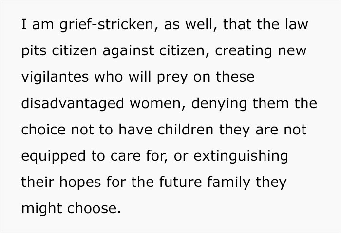 Load More Replies...I was 22 weeks into my pregnancy and was over the moon about it. I had miscarried six times prior to this. At my next ultrasound, we got the devastating news that my baby boy had a condition that meant if he even survived to birth, he would die in agony minutes later. We made the decision not to continue the pregnancy, but my doctor tried to use religion to shame me into going through with the pregnancy, birth, and watching our child die in absolute agony. An abortion is never an easy decision and should stay deeply personal instead of political.