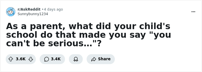 That’s why, when a Redditor asked, "As a parent, what did your child's school do that made you say 'you can't be serious'?", the replies came pouring in. Parents shared some of the most bizarre and surprising school experiences, from head-scratching rules to truly unexpected decisions. Keep reading to uncover these jaw-dropping stories. And don’t miss our insightful interview with Minakshi Pravin Walke, an award-winning ex-principal from the Indian Education Society’s school, who shares her take on modern education policies and challenges!
