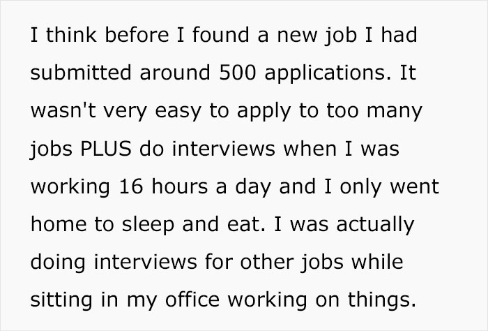 According to u/slw_motion_trainwrck, he was working, on average, 16 hours a day, 7 days a week for over a year. He worked every weekend and through all the holidays. Not just Christmas, mind you. He was busy doing his job during birthdays, too: his own, his wife’s, his kids’. That’s no way to live.