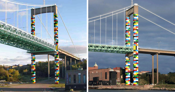 The Älvsborg Bridge is a road suspension bridge connecting the mainland part of Gothenburg to the island of Hisingen, the Bulgarian artist Christo Guelov, wants to paint the whole bridge in formation of blocks reminding the toy Lego.