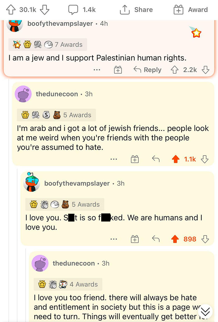 If anyone wants to continue the heartwarming goodwill, Jewish Voice for Peace is a great organization that supports Palestinian self-determination, supports peace and justice in the Middle East, and stands against anti-Jewish, anti-Muslim, and anti-Arab bigotry.
