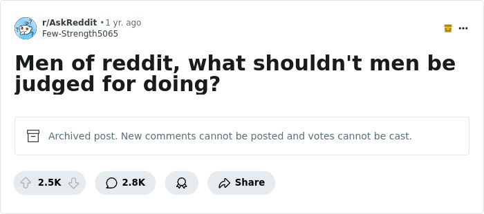 So, for today, our focus will be on the gents, specifically the unfair biases they face for being men. We’re revisiting an old Reddit thread that asked, “What shouldn’t men be judged for doing?”