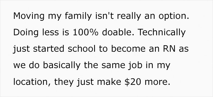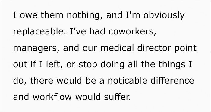 Load More Replies...If the guy can't get another job or move to get another job, the best thing he can do is to stop doing al the extra "behind the scene" work and stick to his job description. None of his employers or co-workers will be working extra without any compensation, so he'd be a fool if he continued working his @ss off, knowing that it won't get him a better pay. If the hospital suffers because of his inactivity, they might reconsider their point of view. If he's capable of arranging matters in a way that his absence would be noted in 3 years, I'm sure he has it in him to be successful and get a better paying job elsewhere. Even if it may set him back now.