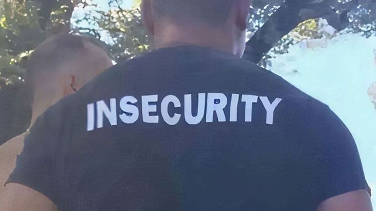 Two people wearing chaotic T-shirts with "shoplifter" messages, standing on a sidewalk.