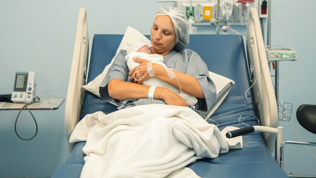 New mother resting in hospital bed, holding newborn baby, reflecting on quiet down and stop screaming after birth. “Can you get off the bed so we can get a picture with the baby”