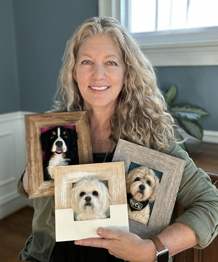 Asked about where the initial idea about creating felted dog portraits came from, the artist told us: “I really wanted felt sculptures of my dogs after seeing this style of art online. I tried making the little handheld sculptures that are popular with most felt artists, but I wasn’t sure what to do with them. Do I display them on a shelf or make them into an ornament? What I personally wanted was something fun to add to my gallery wall. It seemed more substantial and it was how I like to display art in my home. There are many artists who make photo-realistic portraits, but mine are more of a caricature. I try to capture the dog’s personality in a fun style and I hope my customers appreciate their uniqueness.”
